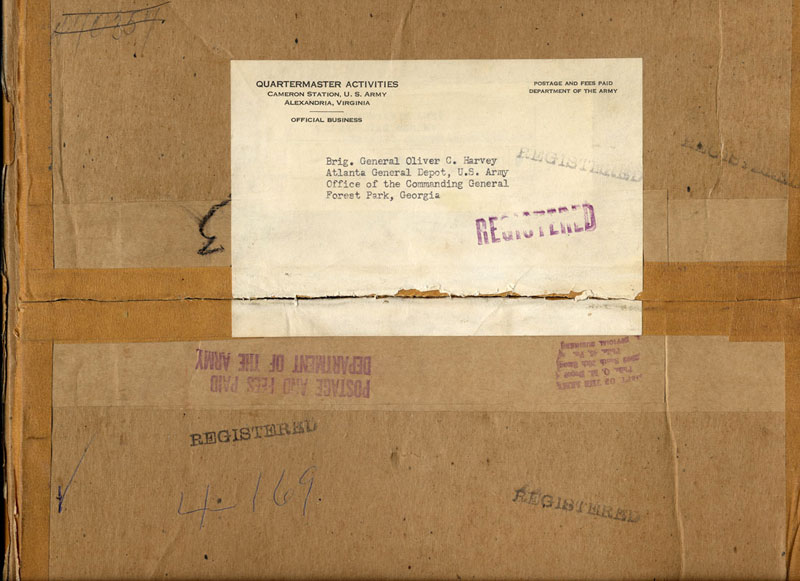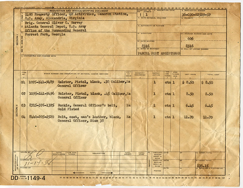 Original outer shipping box from the Quartermaster Activities department, Cameron Station, U.S. Army, Alexandria, Virginia, containing Brigadier General Harvey's General Officer's black belt, gold buckle, black 1911 holster and black 1903 Colt .32 ACP holster.