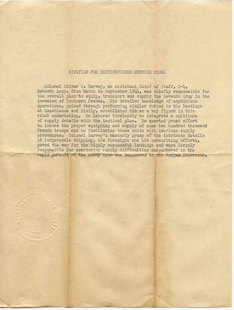 (Then Colonel) Oliver C. Harvey's citation for his Distinguished Service Medal (pictured at center in photo of medals above)