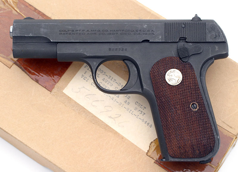 Colt Model M .32 ACP serial number 566926 - Military Model M .32 ACP pistol, issued in 1958 in large 1911 style kraft box, parkerized finish, with U.S. PROPERTY mark on right side of frame and ordnance mark behind the thumb safety on the left side of the frame.  Pistol is documented as having been issued to Major General Oliver C. Harvey and is pictured with the original box numbered to the gun.