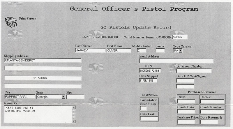 Copy of the database entry screen from Rock Island Arsenal documenting issue of "1 ea Pistol Auto Colt Cal.. .32" to Brigadier General Olicer C. Harvey on November 5, 1958.  Pistol was shipped on November 5, 1958 to the Atlanta Gen Depot, Forrest Park, Georgia.