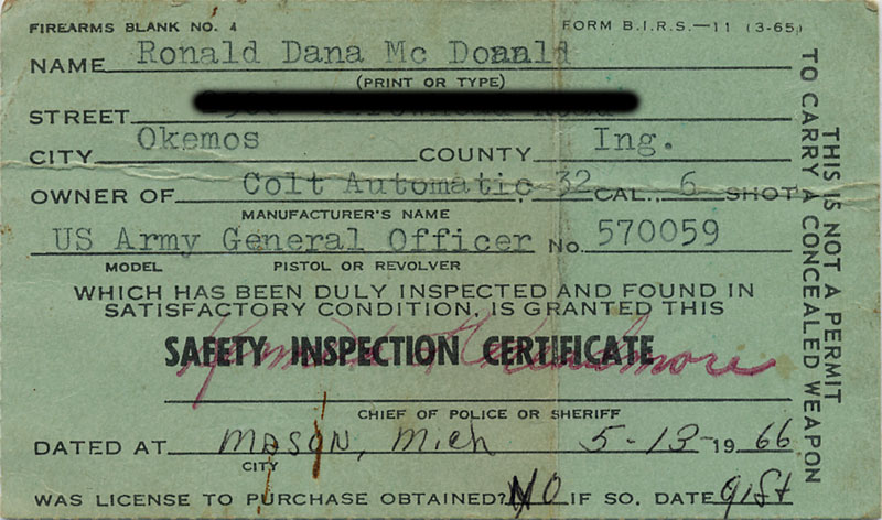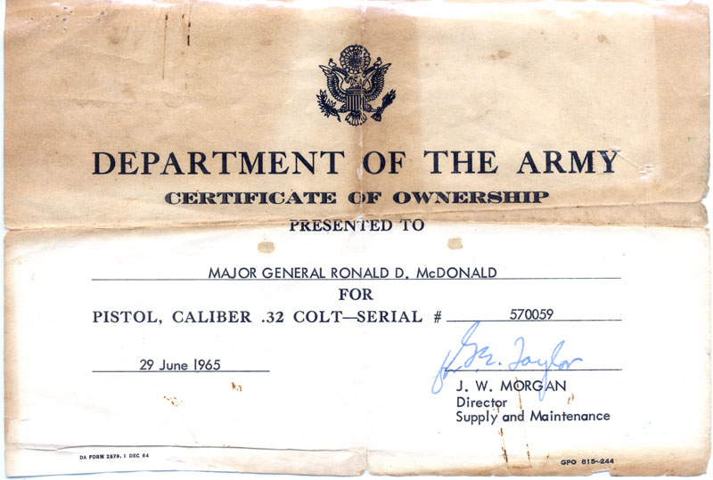 Department of the Army Certificate of Ownership Presented to Major General Ronald D. McDonald for Pistol, caliber .32 Colt - Serial # 570059, 29 June 1965, J.W. Morgan, Director, Supply and Maintenance.  DA Form 2879, 1 Dec 64, GPO 815-244.