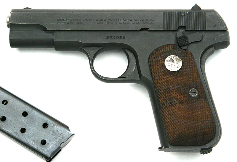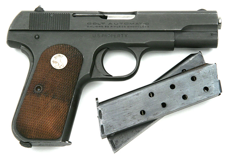 Colt 1903 Pocket hammerless .32 ACP serial number 570059 - right side showing U.S. PROPERTY mark on frame and two spare magazines.