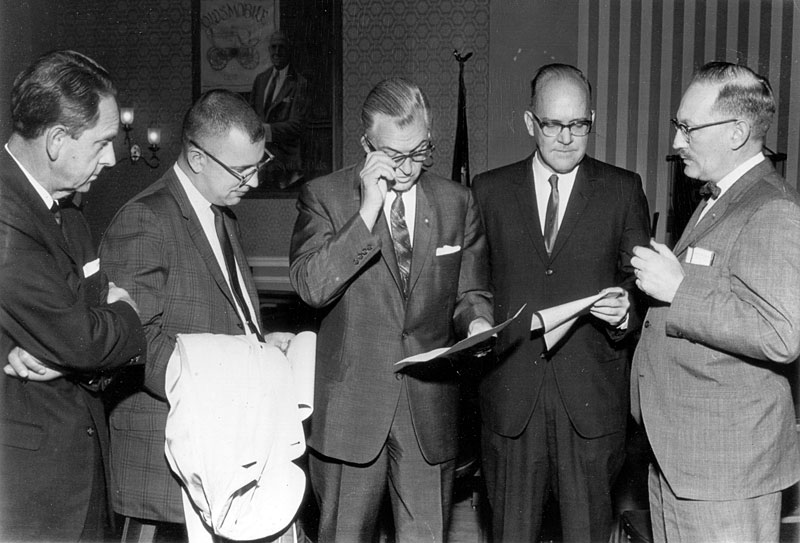 NSP100901-10/9/1964 - LANSING, Mich - Maj. Gen. Ronald McDonald (C) and Brig. Gen. Carson Neifert (2nd from R) got their first look 10/9 at charges Gov. George Romney lodged against them in Michigan's National Guard scandal from a copy offered by a reporter.  McDonald talked with newsman after attending a Rotary Club luncheon and said he and Neifert had never been given specifics on why they were losing their jobs with the Michigan Military Establishment.  UPITELEPHOTO jb