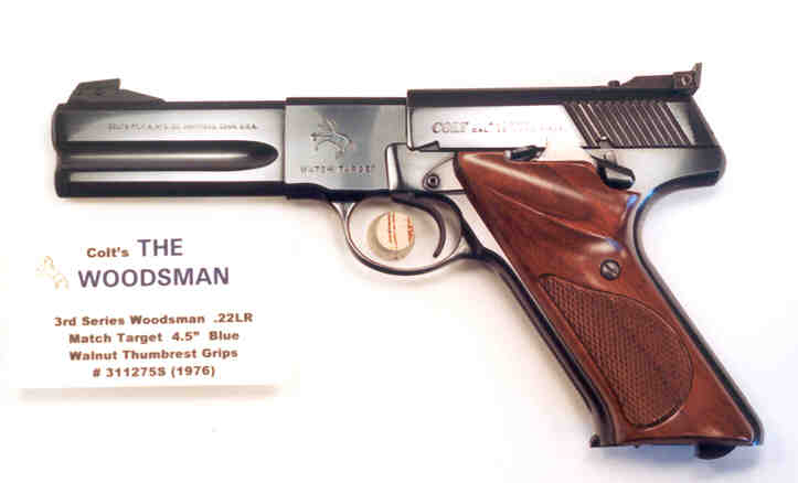 Woodsman 3rd Series Match Target .22LR 4.5" Blue, NIB, SN#311275S (1976) with mint correct original walnut grips w/thumbrest, mint bore, correct mag, correct Elliason adjustable rear sight, original correct and RARE blue front instruction sheet showing Elliason rear sight, Colt sight adjustment tool in folded kraft envelope, list of authorized Colt warranty service stations and Handling the Handgun brochure, in correct original woodgrain sleeve/styrofoam insert box with label intact and numbered to gun.  Gun is a strikingly MINT example of the rare 4.5" 3rd Series Match Target and unfired!